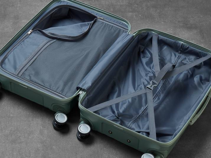 The interior of Aspen has luxurious soft touch lining and a mesh divider section. The design also features a convenient zipped inside pocket and adjustable packing straps to keep your clothes securely in place.