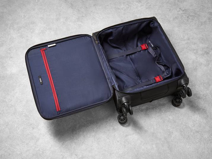 The interior of Deluxe-Lite has luxurious soft touch lining and a mesh divider section. The design also features a convenient zipped inside pocket and adjustable packing straps to keep your clothes securely in place.