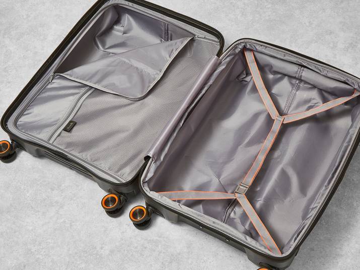 The interior of Genesis has luxurious soft touch lining and a mesh divider section. The design also features a convenient zipped inside pocket and elasticated packing straps to keep your clothes securely in place.