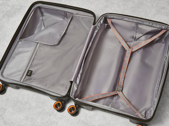The interior of Genesis has luxurious soft touch lining and a mesh divider section. The design also features a convenient zipped inside pocket and elasticated packing straps to keep your clothes securely in place.