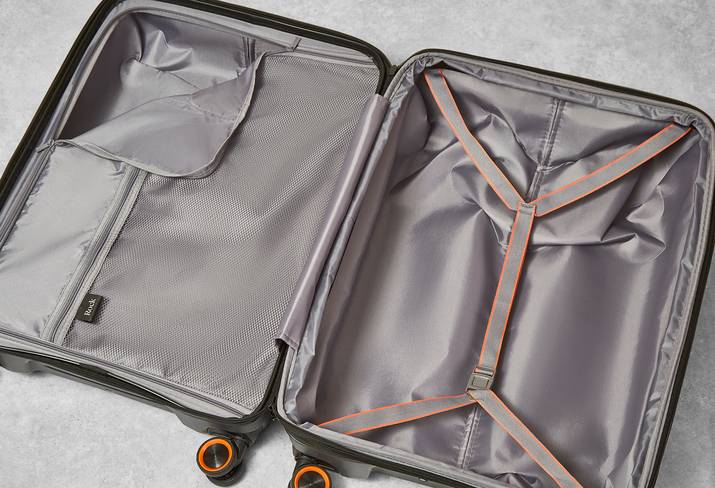 The interior of Genesis has luxurious soft touch lining and a mesh divider section. The design also features a convenient zipped inside pocket and elasticated packing straps to keep your clothes securely in place.