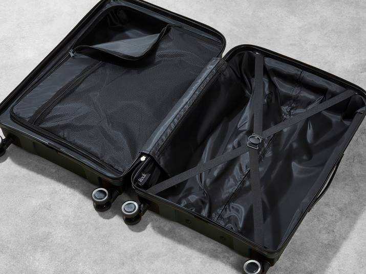 The interior of Hudson has luxurious soft touch lining and a mesh divider section. The design also features a convenient zipped inside pocket and elasticated packing straps to keep your clothes securely in place.