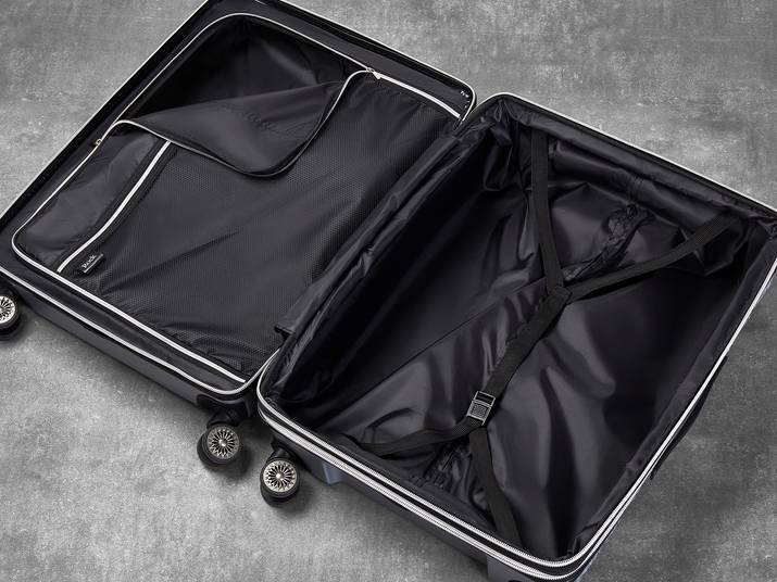 The interior of Maya has luxurious soft touch lining and a mesh divider section. The design also features a convenient zipped inside pocket and adjustable packing straps to keep your clothes securely in place.