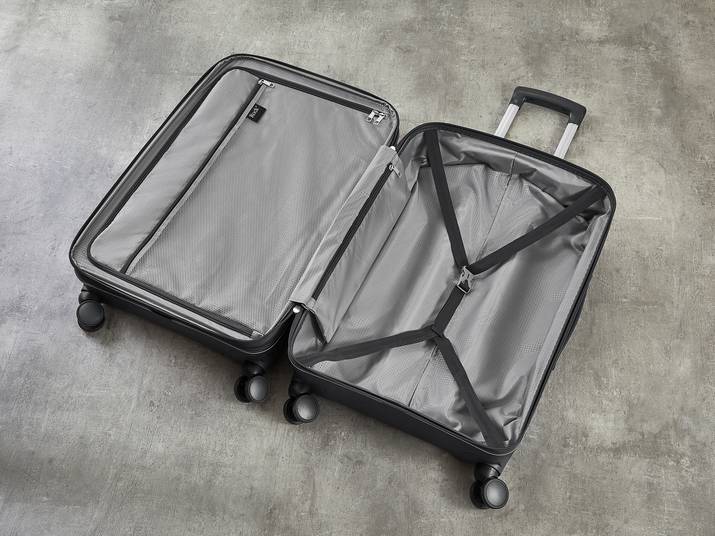 The interior of Prime has luxurious soft touch lining and a mesh divider section. The design also features a convenient zipped inside pocket and elasticated packing straps to keep your clothes securely in place.