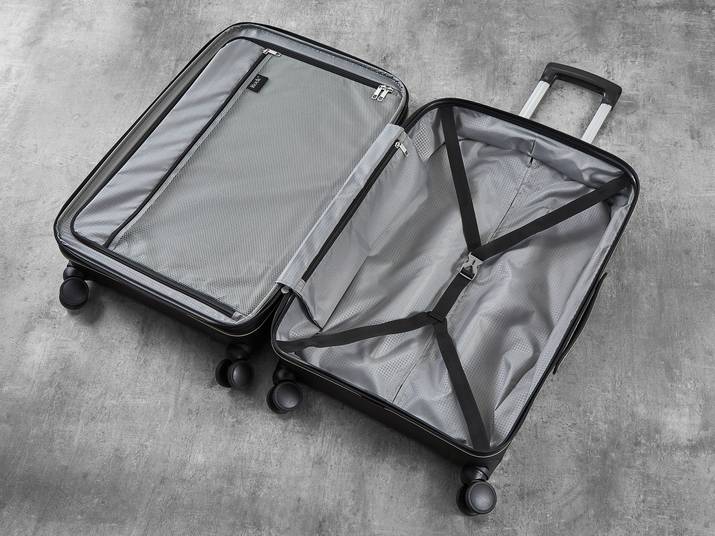 The interior of Prime has luxurious soft touch lining and a mesh divider section. The design also features a convenient zipped inside pocket and elasticated packing straps to keep your clothes securely in place.