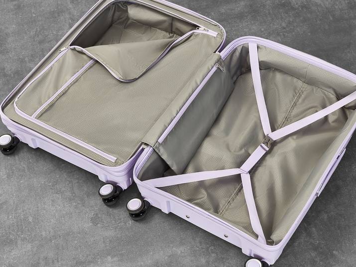 The interior of Sunwave has luxurious soft touch lining and a mesh divider section. The design also features a convenient zipped inside pocket and elasticated packing straps to keep your clothes securely in place.