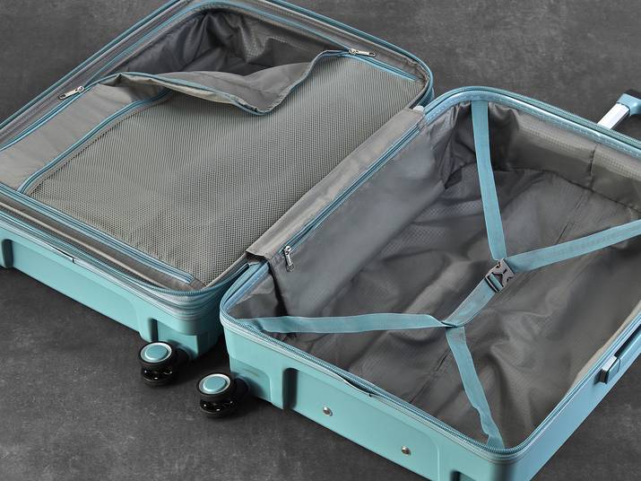 The interior of Sunwave has luxurious soft touch lining and a mesh divider section. The design also features a convenient zipped inside pocket and elasticated packing straps to keep your clothes securely in place.
