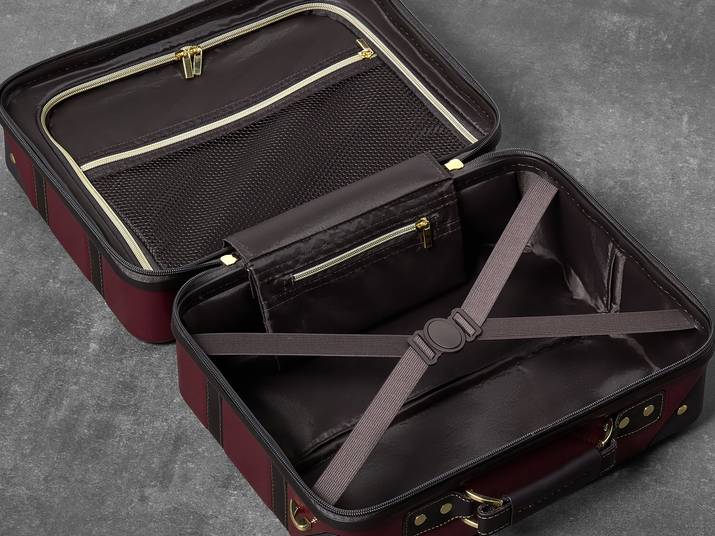 The interior of Vintage Vanity has luxurious soft touch lining and two main sections. The design also features two convenient zipped inside pockets and adjustable packing straps to keep your on board necessities securely in place.